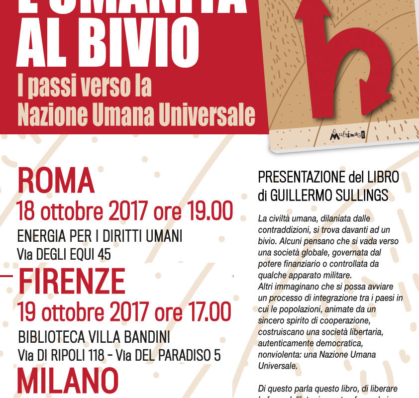 Tre anni fà Guillermo Suillings, autore del libro “Oltre il Capitalismo: Economia Mista.”, ha fatto il tour Italiano di presentazione del suo precedente libro, quest’anno presenta il libro progetto “L’UMANITÀ AL BIVIO I passi verso la Nazione Umana Universale”.